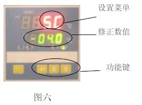 7.1.3 (見圖六)再按“SET”鍵若干次,找到所需要調整的控制參數(shù)的“SC”提示符,按功能鍵,使該控制參數(shù)顯示為所需要的值;SC = 原始SC值 +(實際溫度 - PV顯示值)