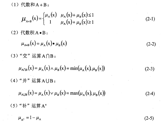 對模糊集合運算時,注意要有同等個數的集合元素參加運算。模糊集合的運算可分為代數運算和邏輯運算,主要有以下幾種: